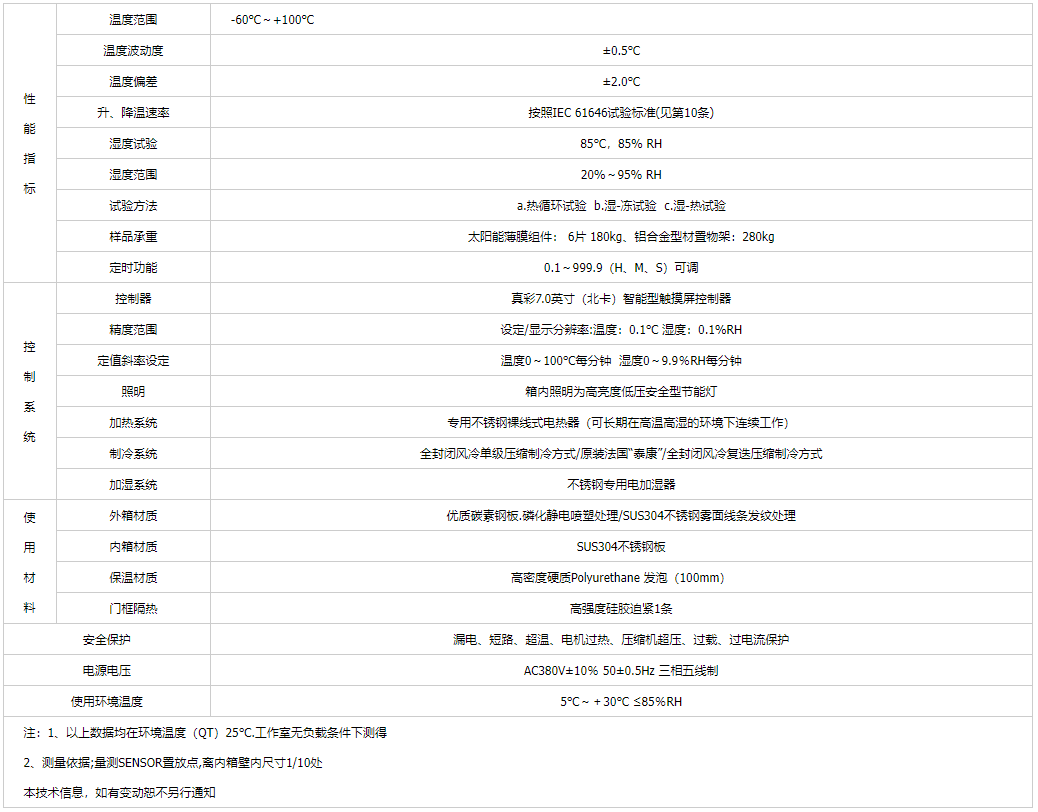 產(chǎn)品簡介:光伏濕凍試驗(yàn)箱適用于光伏組件(太陽能電池板)做熱循環(huán)、濕凍循環(huán)、高溫高濕雙85試驗(yàn),以確認(rèn)組件能否承受高溫高濕之后隨之的負(fù)溫度影響,以及對于溫度重復(fù)變化時(shí)引起的疲勞和熱失效,另外確定光伏組件曝露在高濕度下而產(chǎn)生的熱應(yīng)力及能夠抵抗?jié)駳忾L期滲透的能力.是光伏組件行業(yè)必不可少的測試設(shè)備。