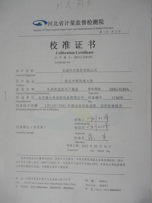 >>電熱恒溫鼓風干燥箱校準證書-河北計量院-長城汽車