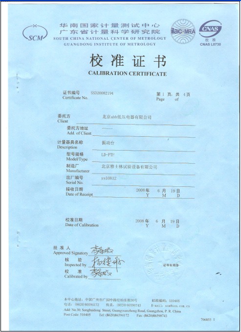 >>振動(dòng)試驗(yàn)臺校準(zhǔn)證書-廣東計(jì)量院-ABB集團(tuán)