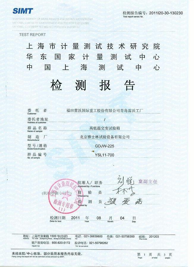 >>高低溫交變?cè)囼?yàn)箱檢測(cè)報(bào)告-上海計(jì)量院-福田雷沃