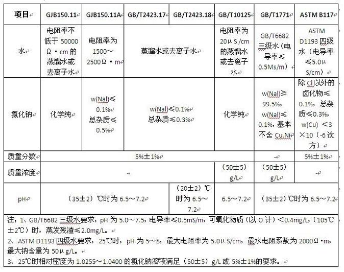 在鹽霧試驗箱不同標(biāo)準(zhǔn)中對鹽霧試驗用的鹽溶液有不同的要求,見下表: