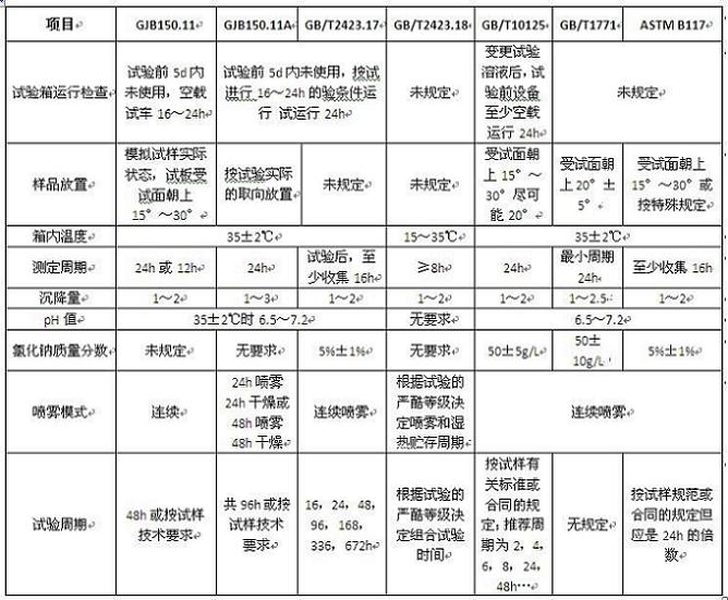 鹽霧試驗(yàn)箱要保證試驗(yàn)結(jié)果的正確性,必須控制好試驗(yàn)過程。試驗(yàn)過程的控制包括:試驗(yàn)箱運(yùn)行檢查、樣品放置、箱內(nèi)暴露區(qū)溫度、沉降液的參數(shù)(沉降量、PH值和氯化鈉質(zhì)量濃度)等,不同標(biāo)準(zhǔn)對鹽霧試驗(yàn)過程的控制要求見下表:
